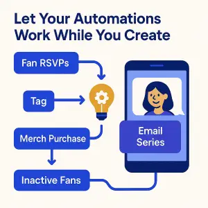From thanking merch buyers to re-engaging quiet fans, our AI-powered workflows do the heavy lifting for you.